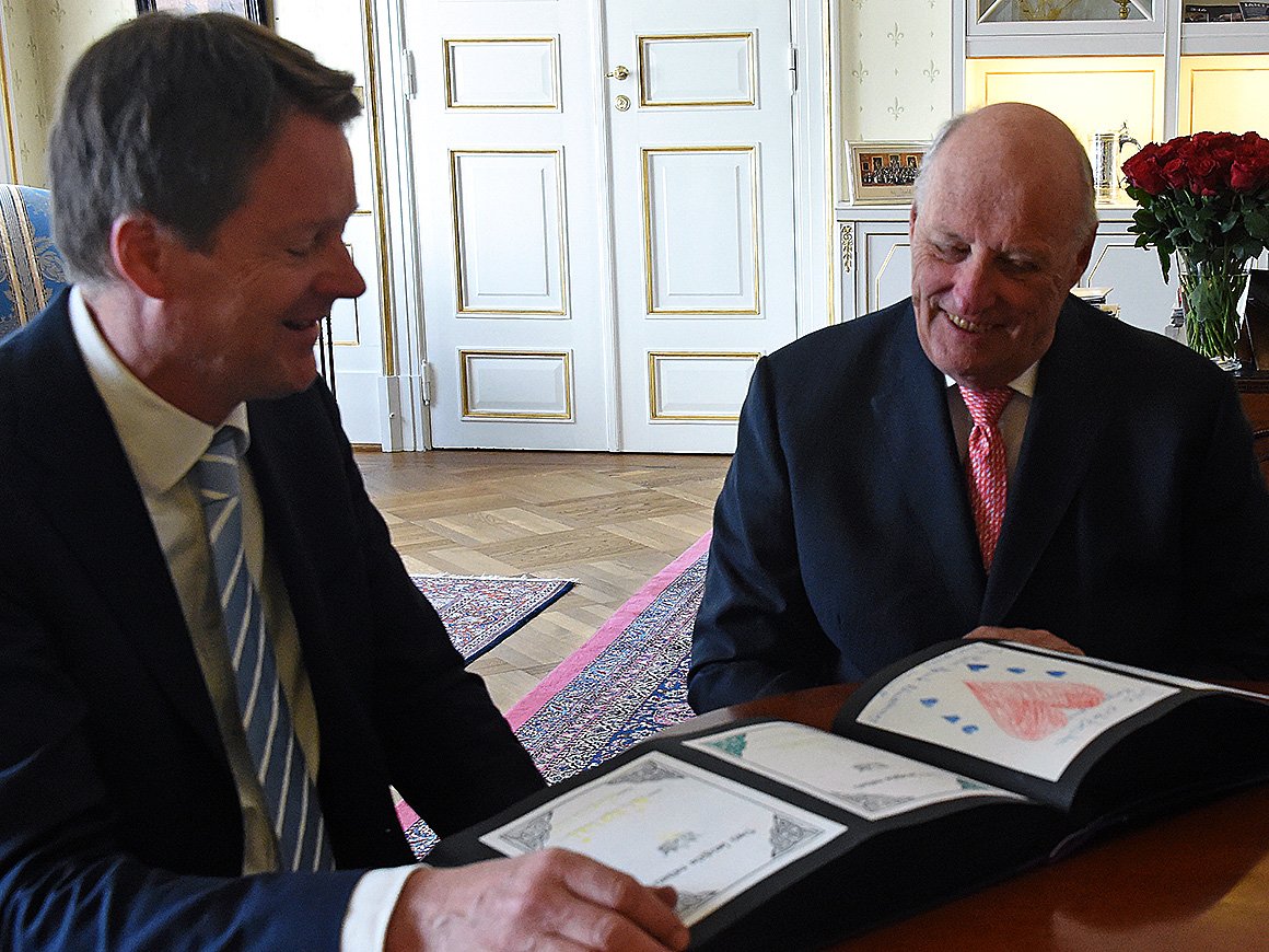 Nasjonalmuseets direktør Audun Eckhoff ble mottatt av Hans Majestet i audiens på Slottet. Eckhoff kom for å overlevere i overkant av 1000 barnetegninger og hilsener til Kongeparet.