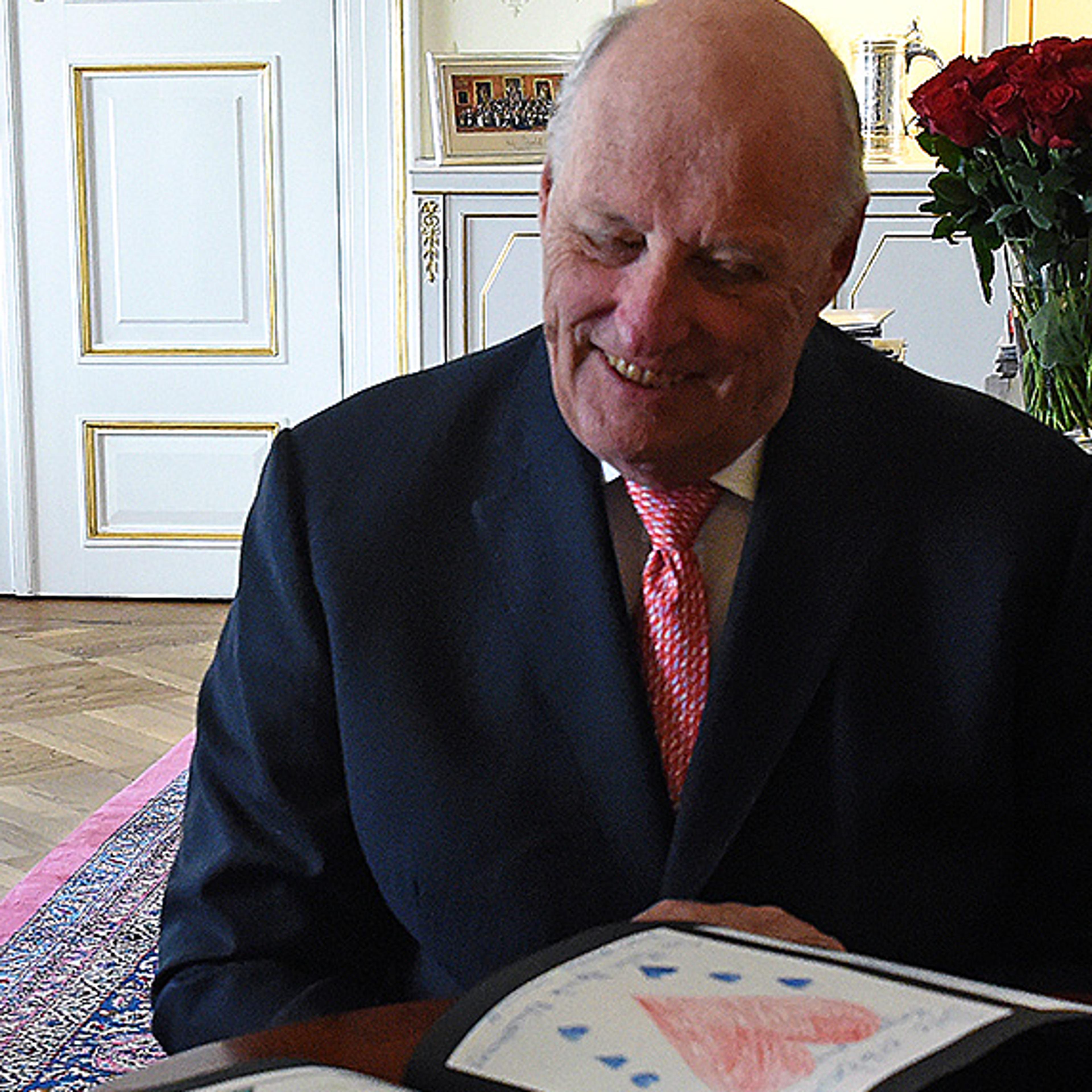 Hans Majestet Kong Harald fikk overbrakt mer enn 1000 barnetegninger og hilsener i går - bundet inn i regi av Nasjonalmuseet.