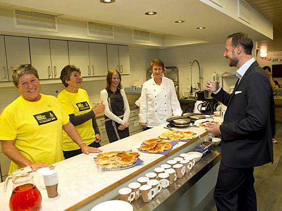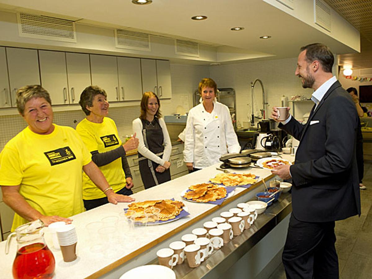 Etter omvisinga vart det tid til å teste ut årets vaffelrøre som bøsseberarar får servert på søndag. Sigrid Wisløff og Kristen Lindgaard frå «60+»-gruppa ved frivilligsentralen hadde steikt vaflar og kokt kaffi til Kronprinsen og dei frivillige på sentralen. Kvar torsdag møtest mellom 50 og 70 personar i alderen 60+ for å gå tur og ete god mat saman. Wisløff brukte god tid til å fortelje om kor flott Stovner var, og om dei gode skiforholda i Lillomarka.
