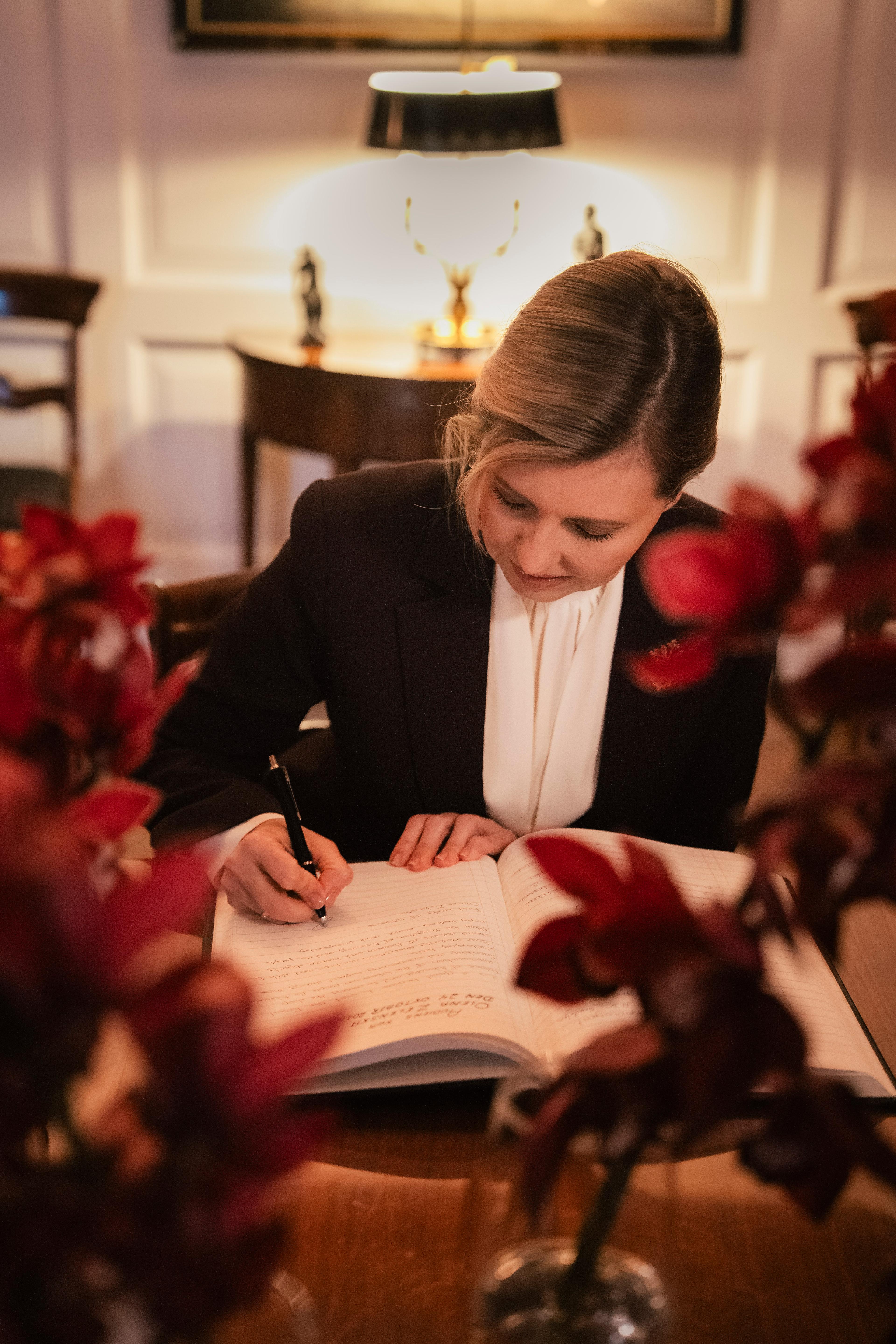 Hennes Kongelige Høyhet Kronprinsesse Mette-Marit tok imot førstedamen, som er på et flere dager langt besøk i Norge. Etter den tradisjonelle signeringen av gjesteboken gikk de videre til en audiens, der også Hans Kongelige Høyhet Kronprins Haakon deltok.