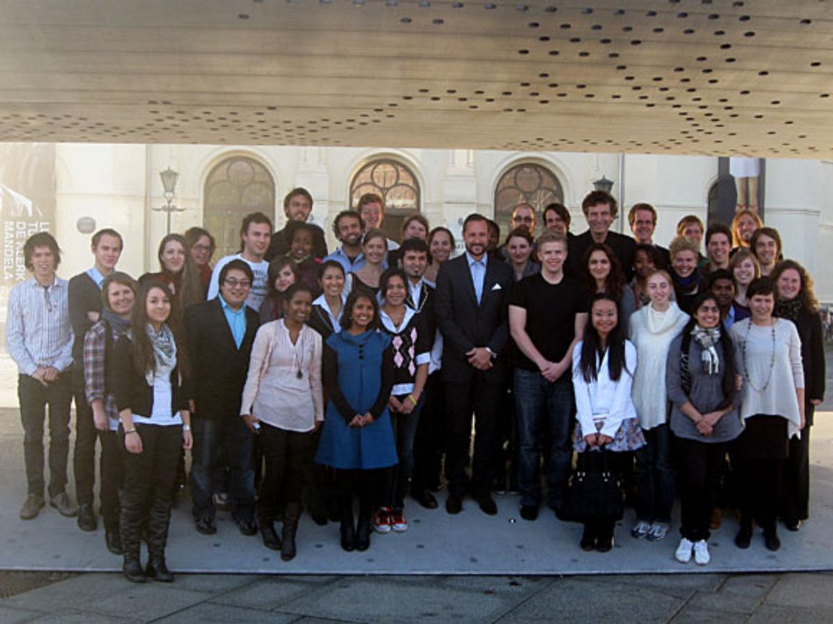 Rektor ved Nansenskolen Dag Hareide tok imot Kronprinsen saman med to av gruppedeltakarane, Irene Incerti og Vegard Amundsen.