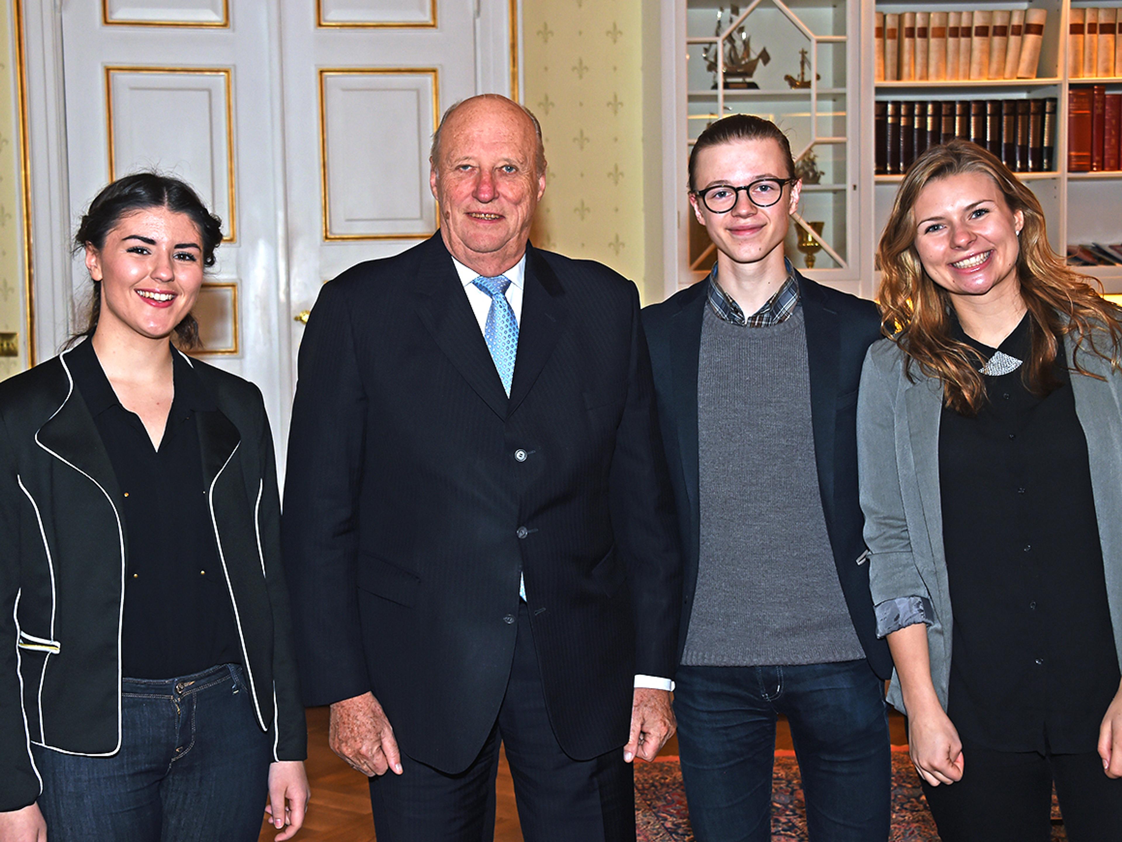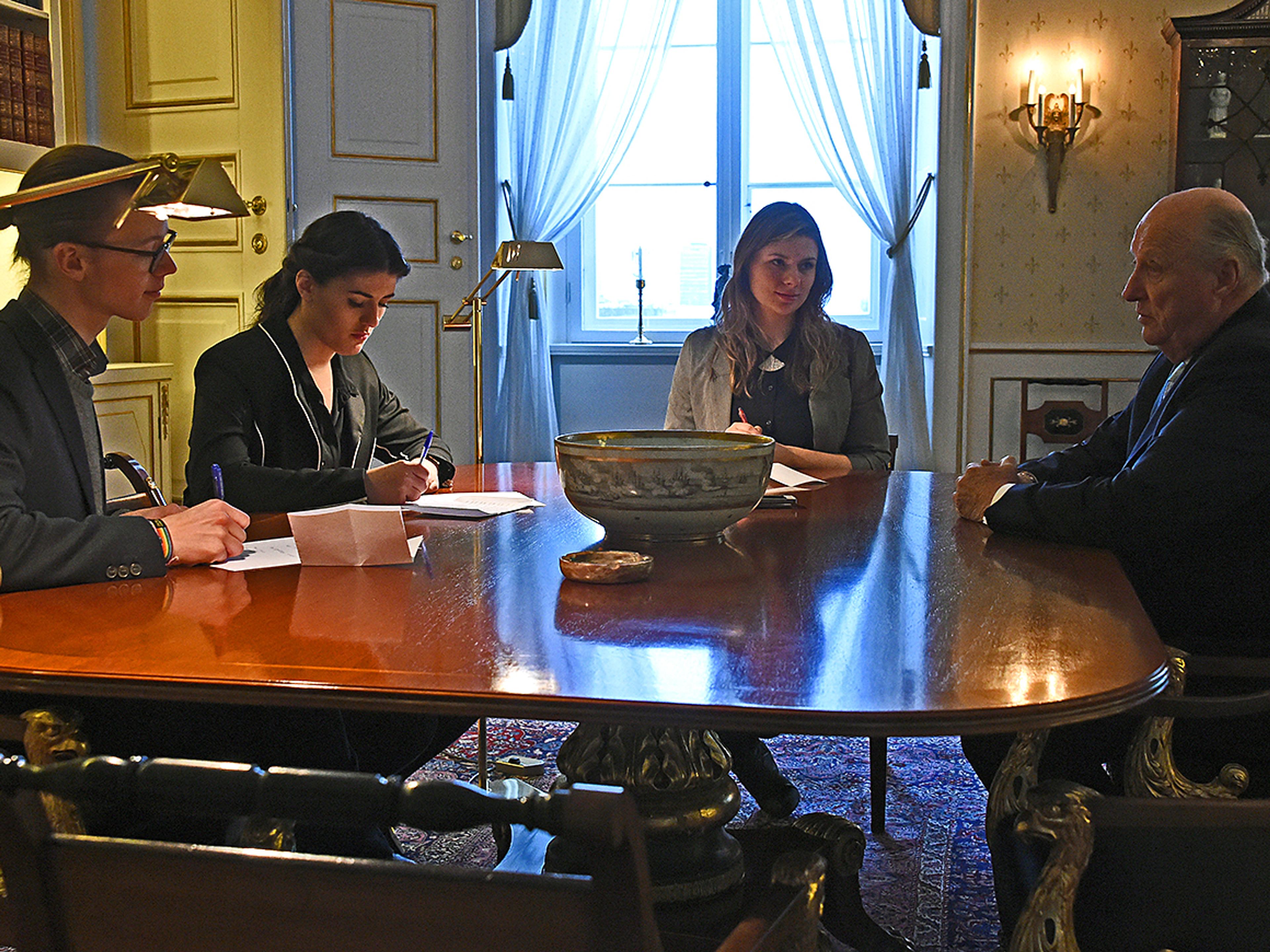 Sist fredag kom derfor Maria Skage El-Yousef (17) og Gjermund Clausen-Bekkelien (16) sammen med journalist Amalie Lereng til Det kongelige slott, der de kunne ta plass rundt møtebordet på Kong Haralds kontor.