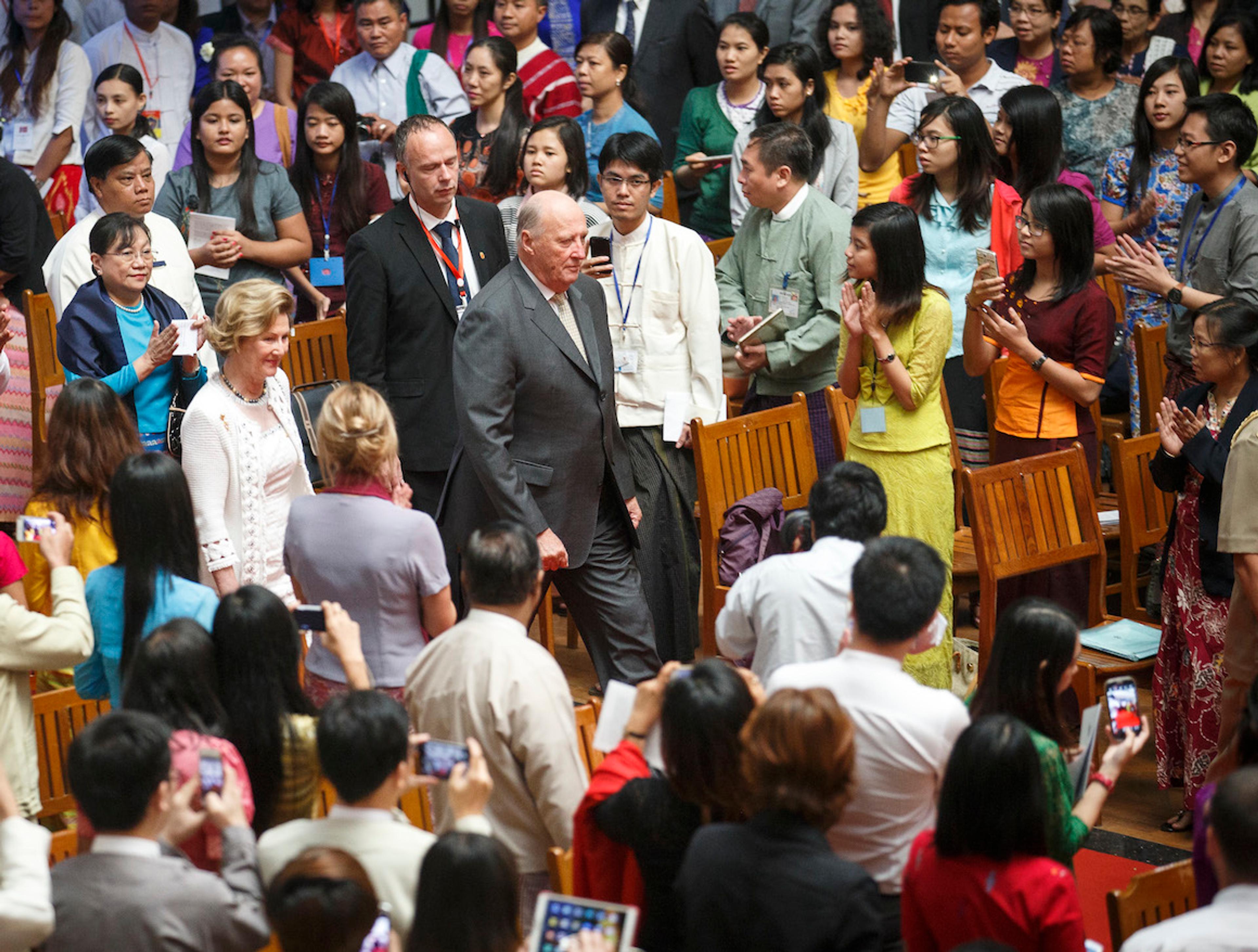 I den historiske foredragssalen sat representantar for myanmarske styresmakter, diplomatkorps og studentar ved universitetet. Kong Harald uttrykte støtte til avgjerda landet har teke om å byggje ei fredeleg og demokratisk framtid – og respekt for dei vanskane landet står overfor: