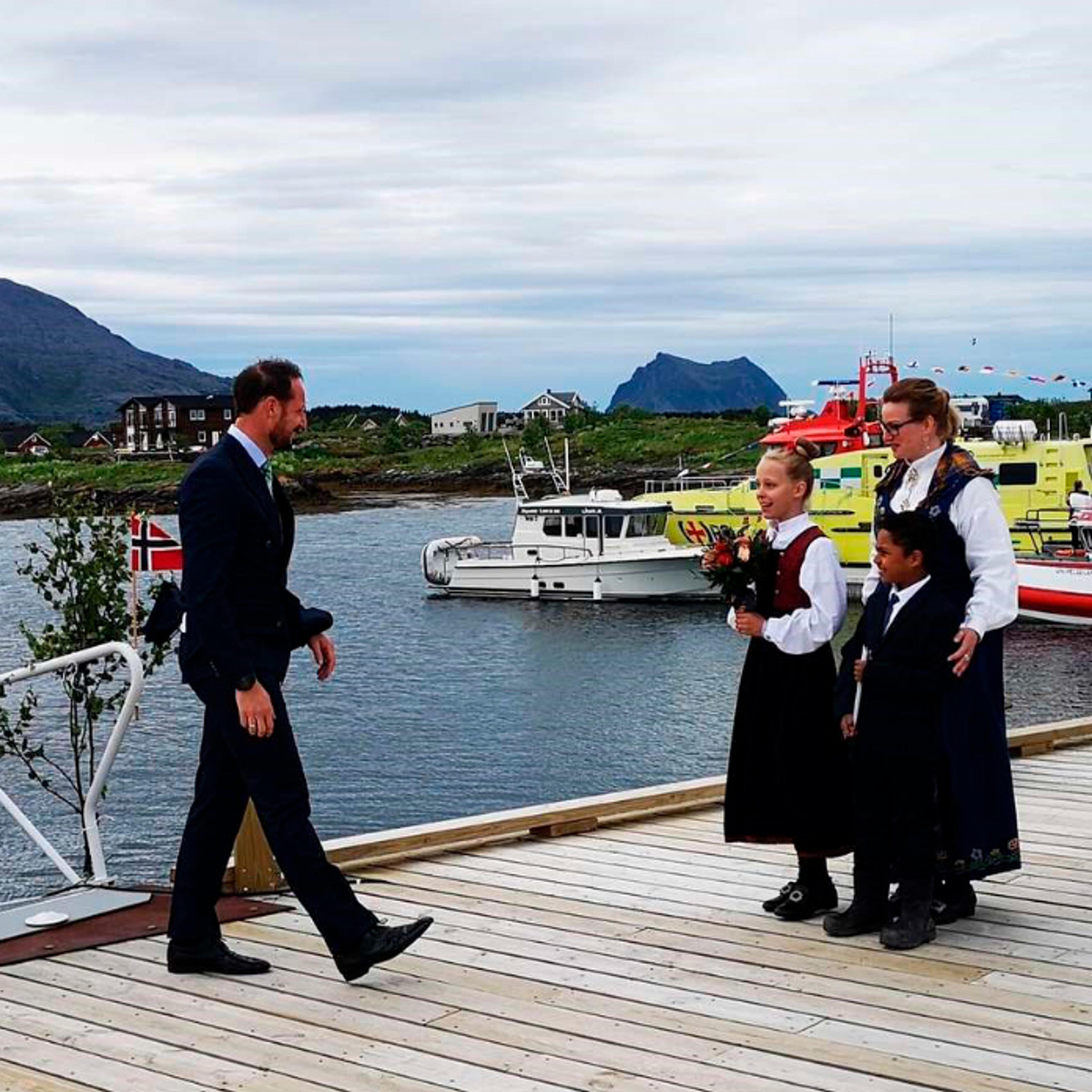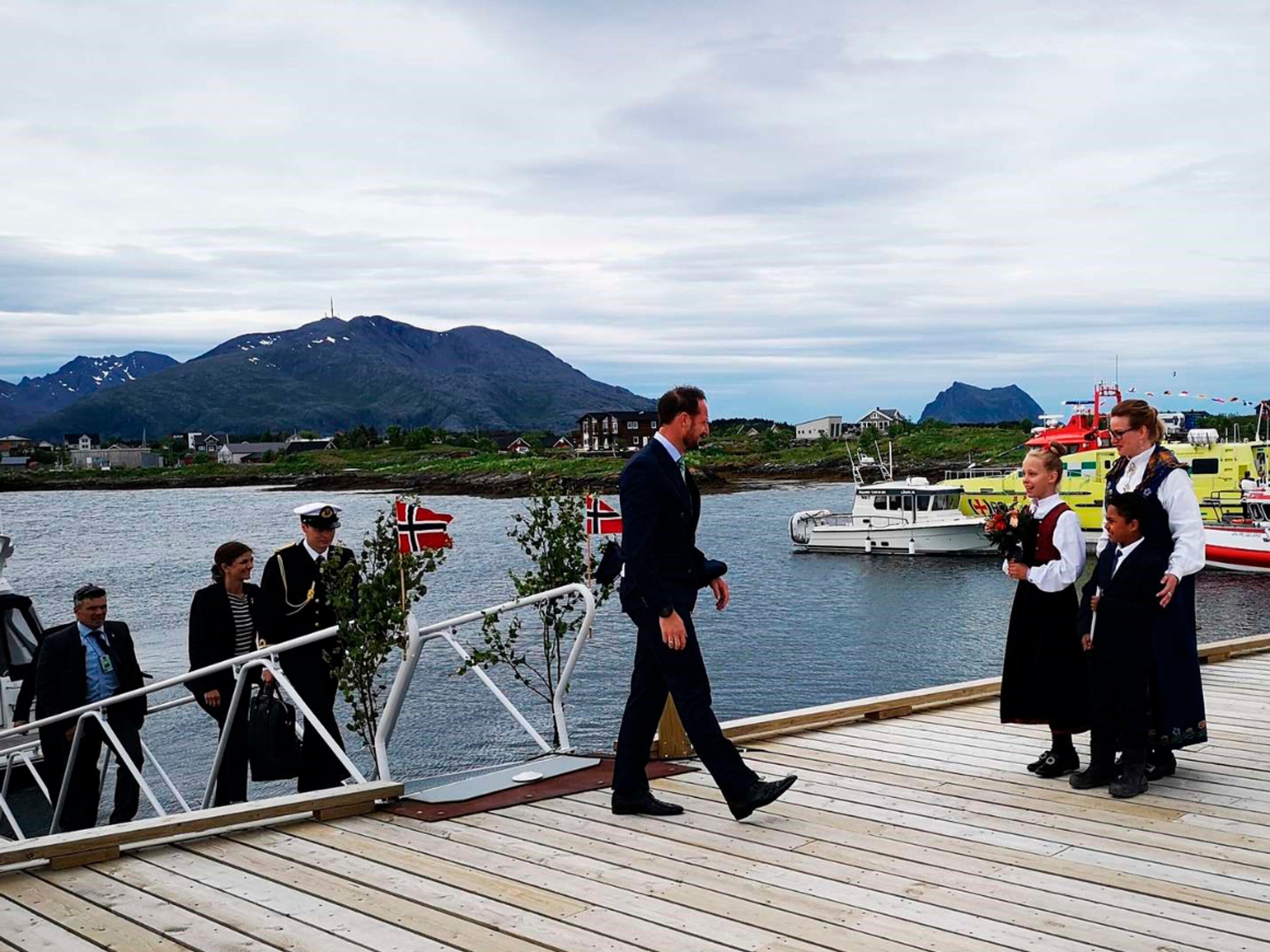 Kronprins Haakon ankom Vega Fiskerihavn med Kongeskipet Norge. Der ble han tatt imot med hornmusikk av innbyggere på øyene, med ordfører Andre Møller og fylkesmann Tom Cato Karlsen i spissen.
