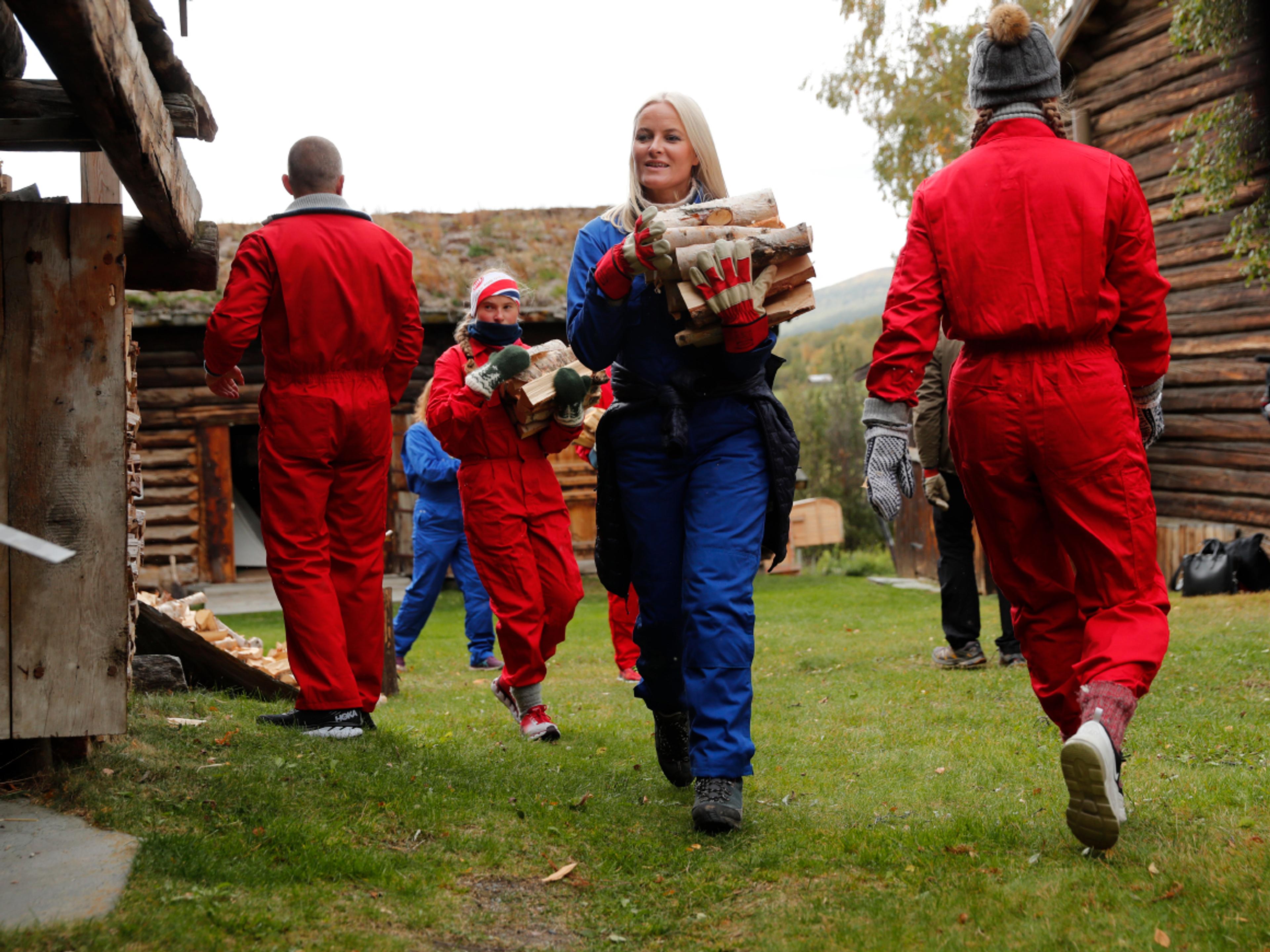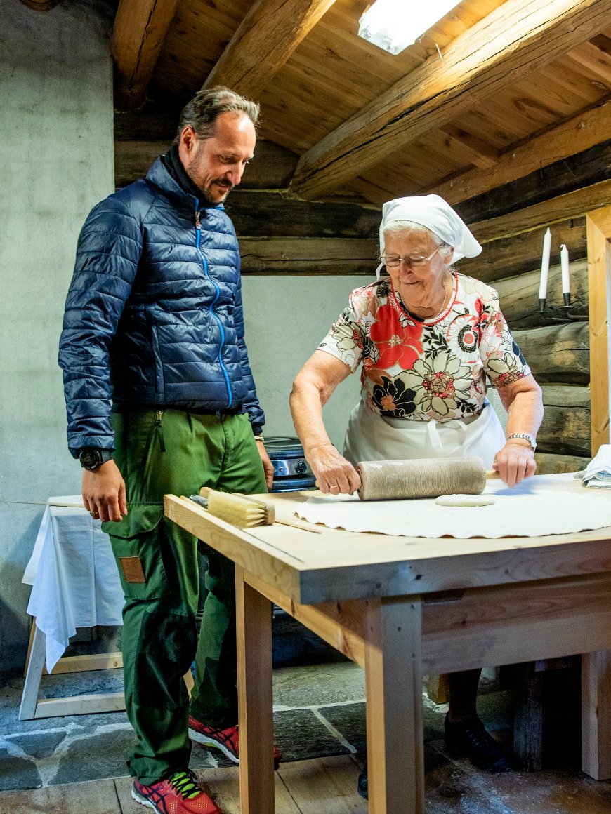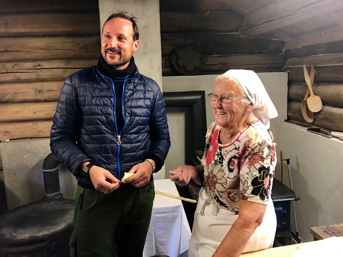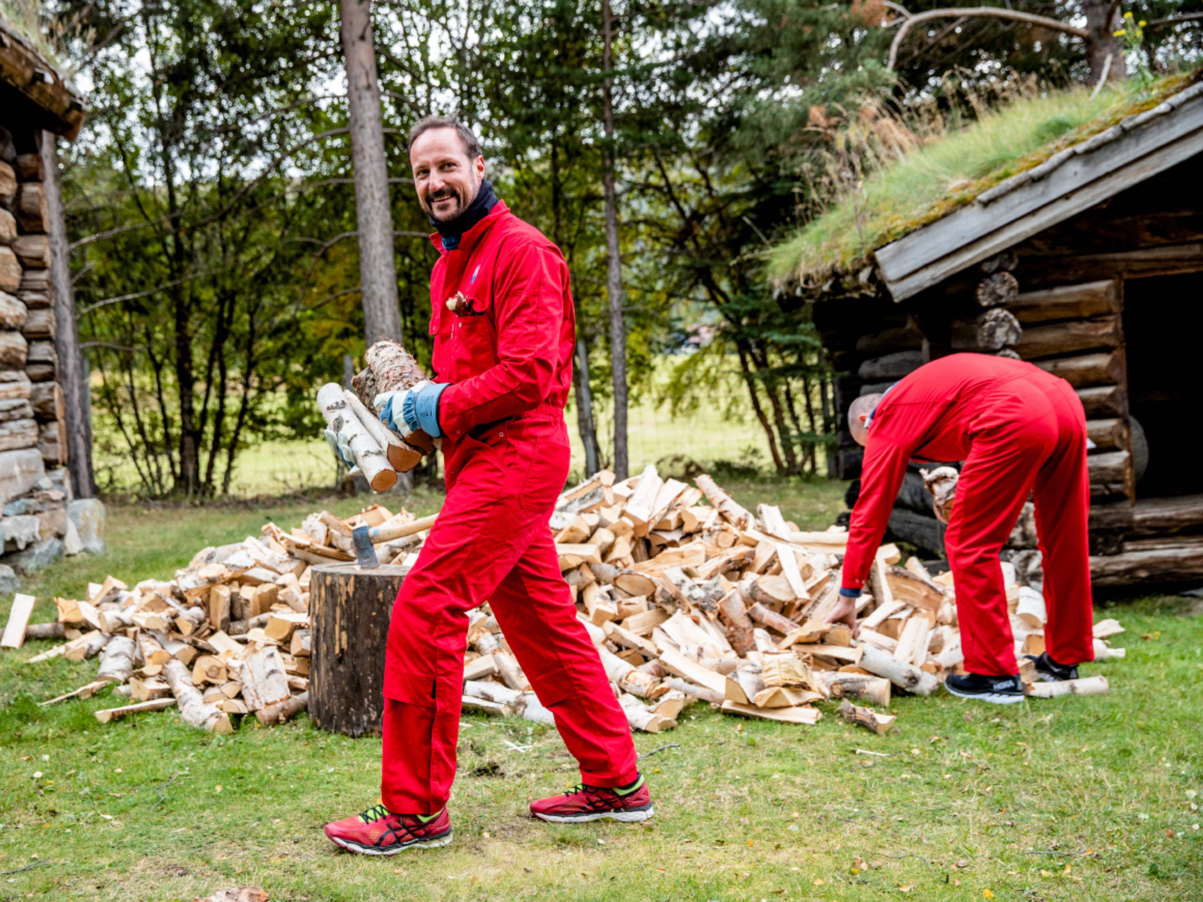 Da var vel ingenting meir naturleg enn å ta på arbeidstøy og stille til dugnad. Kronprinsparet og dei andre gjestene vart sette i sving med raking, vedstabling og andre gjeremål på Lesja bygdemuseum.
