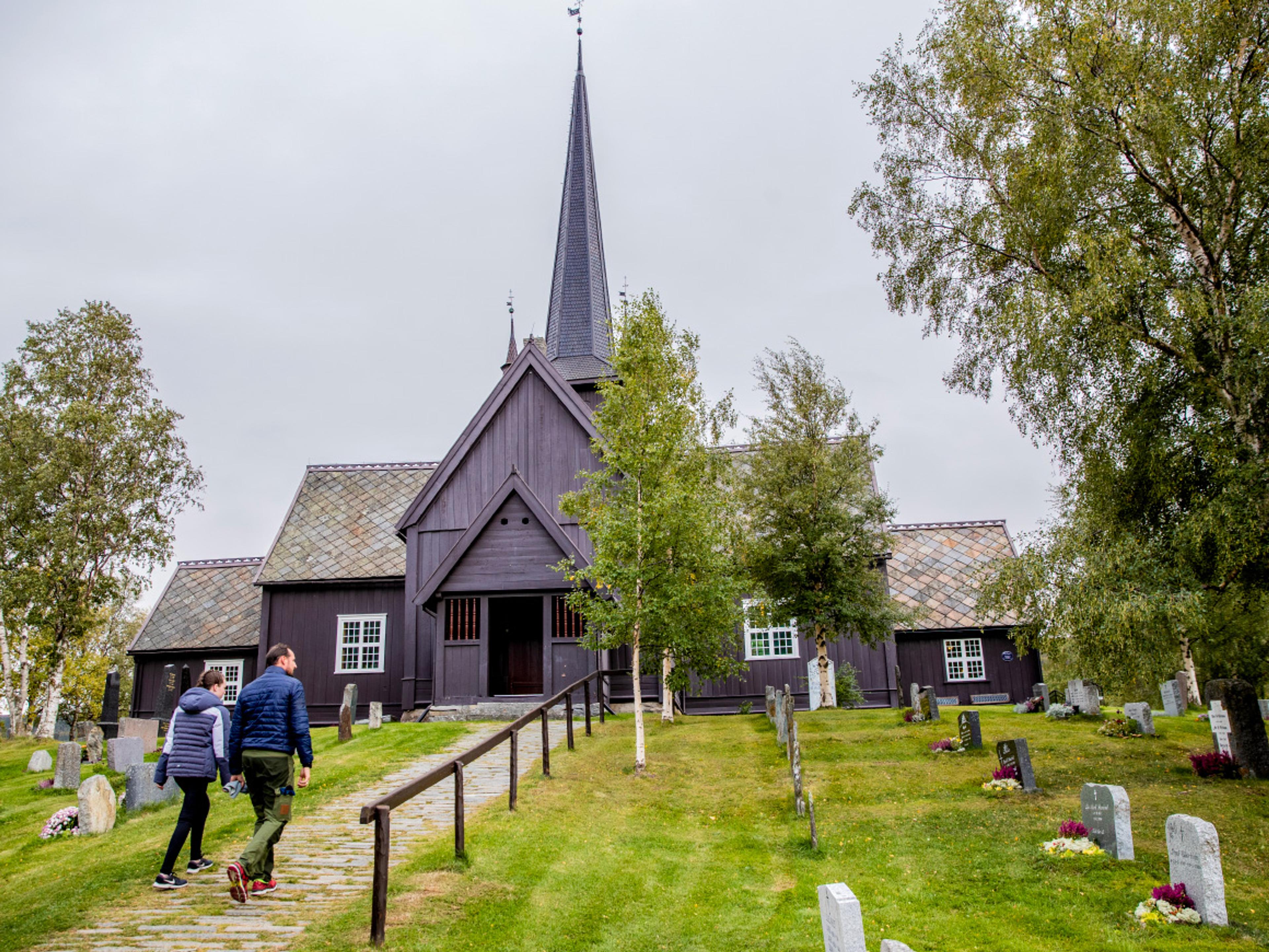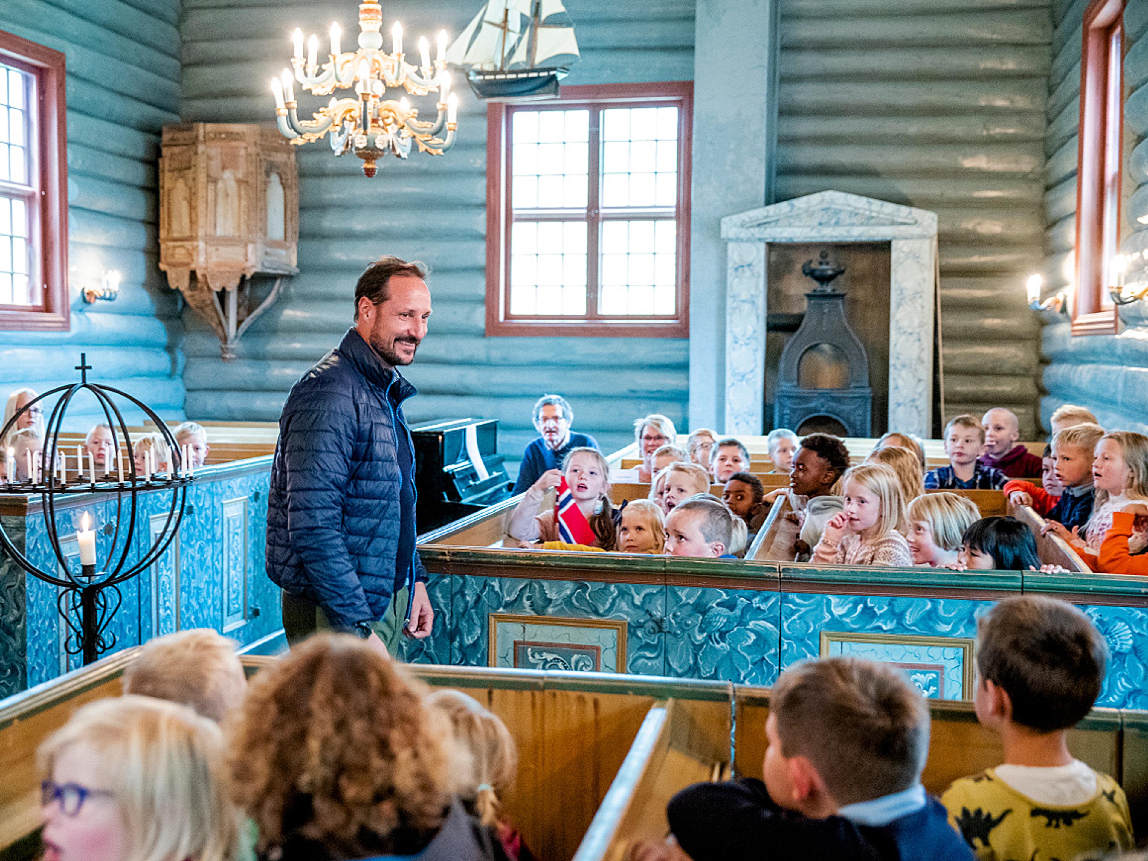 Frida Gangsås på 16 år viste Kronprinsen omkring i kyrkja, før barn og unge strøymde inn i kyrkja, der dei song Lesjasongen.