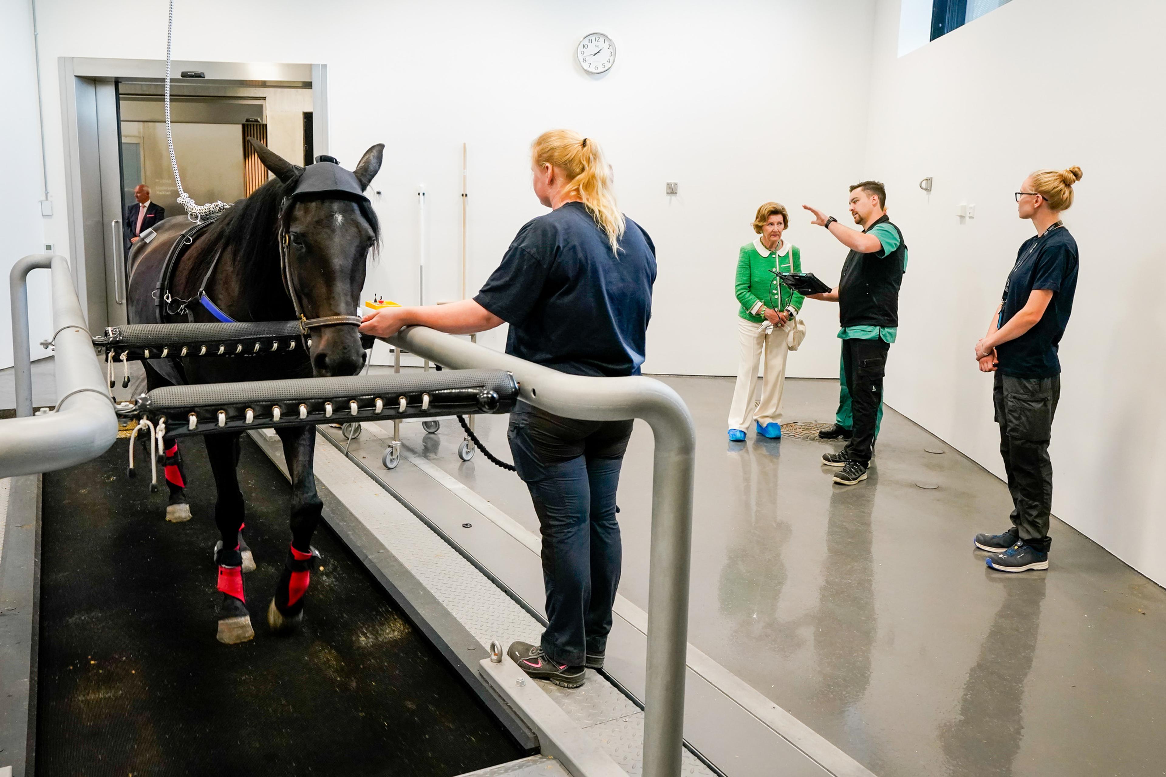 Dronninga fekk sjå nokre av dei fine fasilitetane som bygget rommar. Ein hund fekk behandling i eit rehabiliteringsbasseng. Og omvisingen vart avslutta i hestekorridoren der travhesten Grand Velocity vart utgreidd mens han sprang på ei tredemølle.