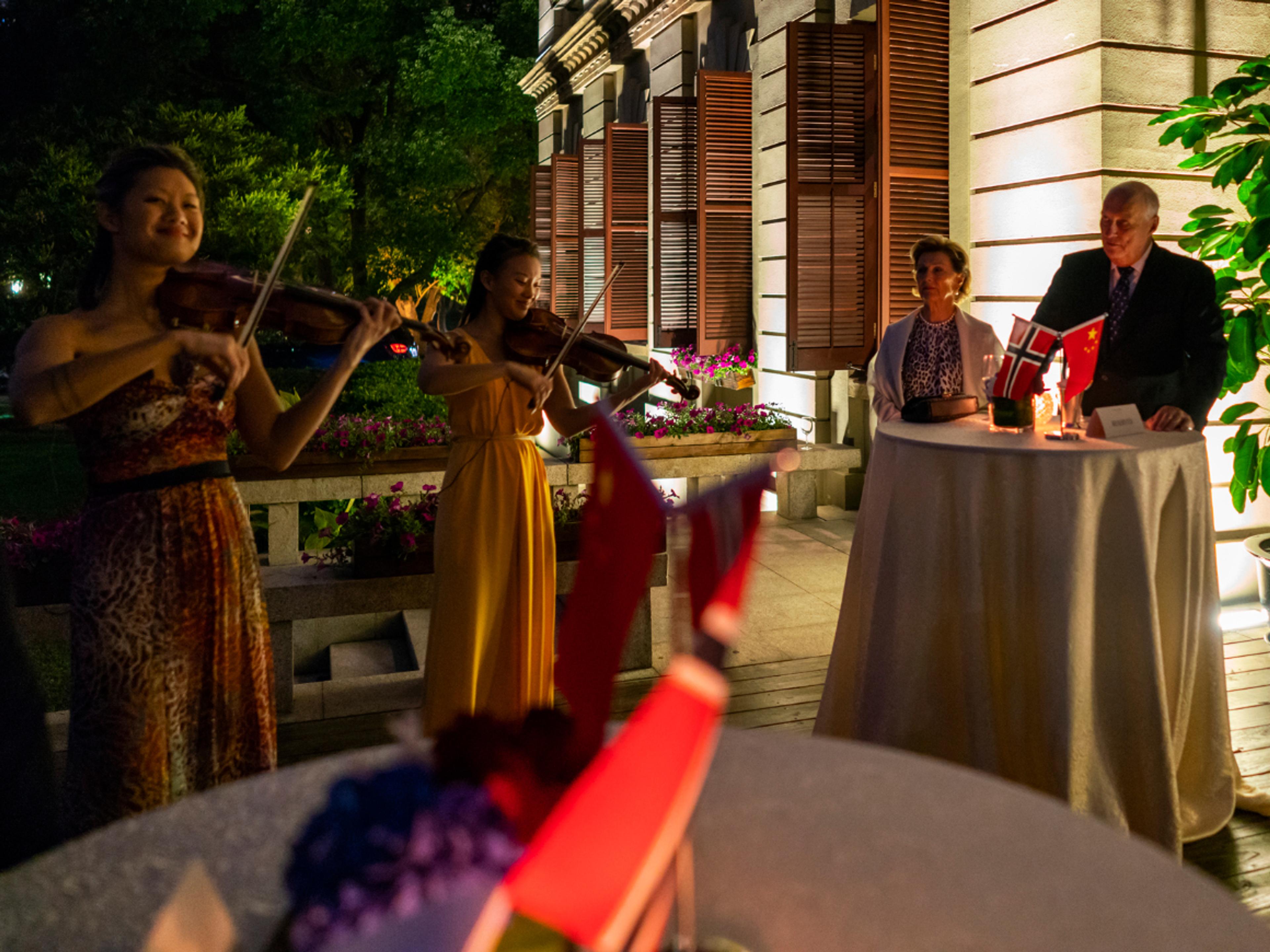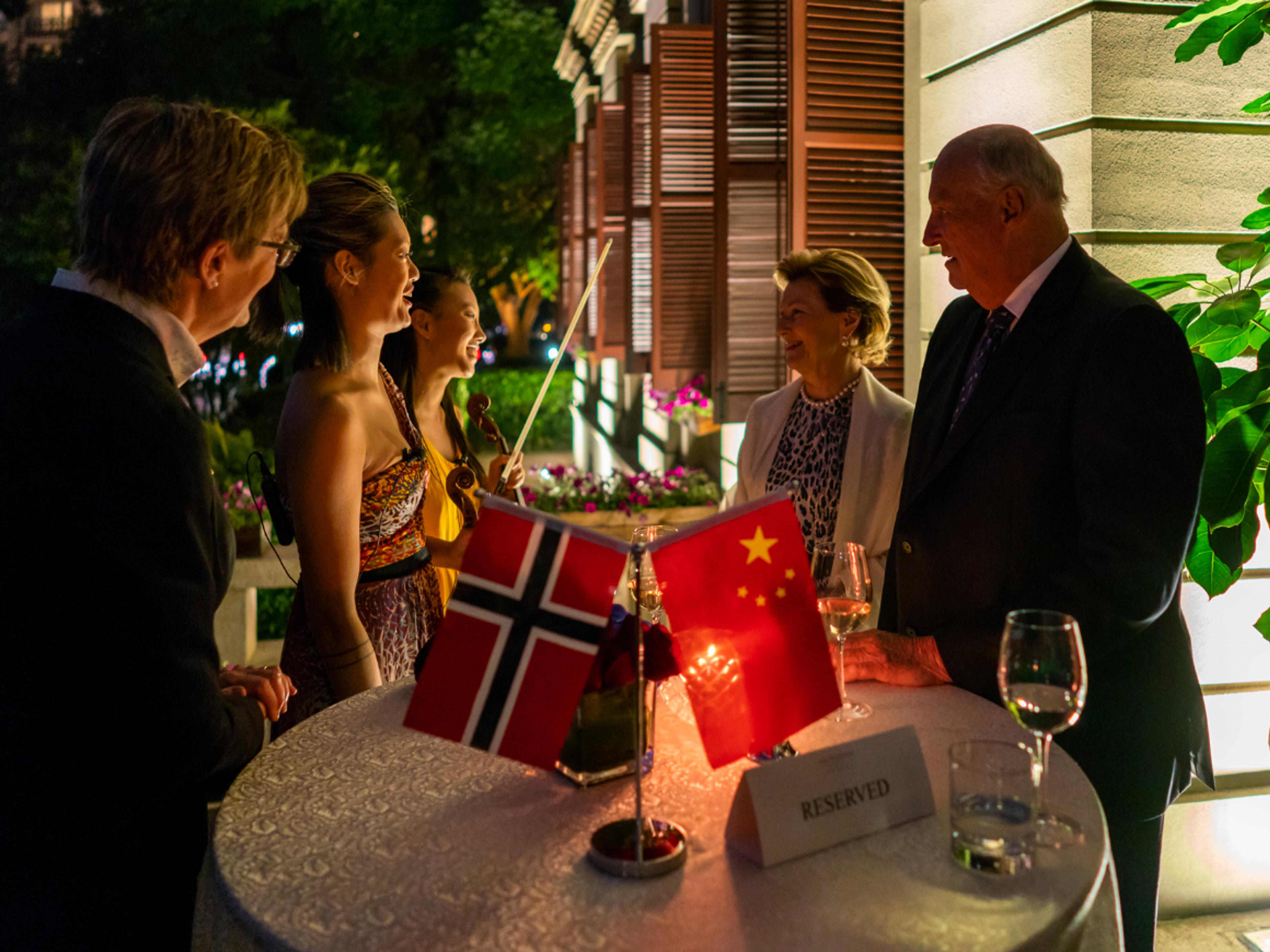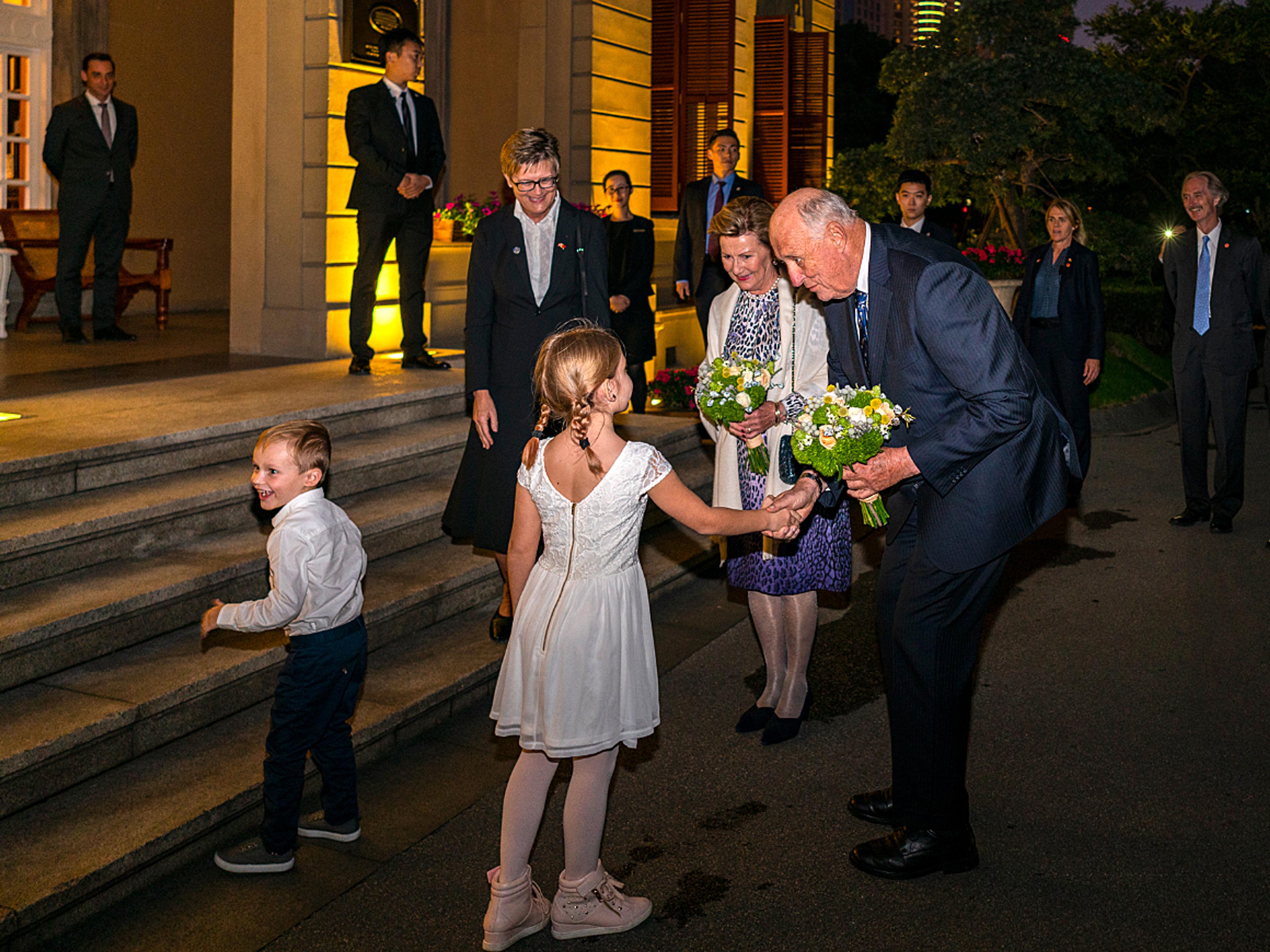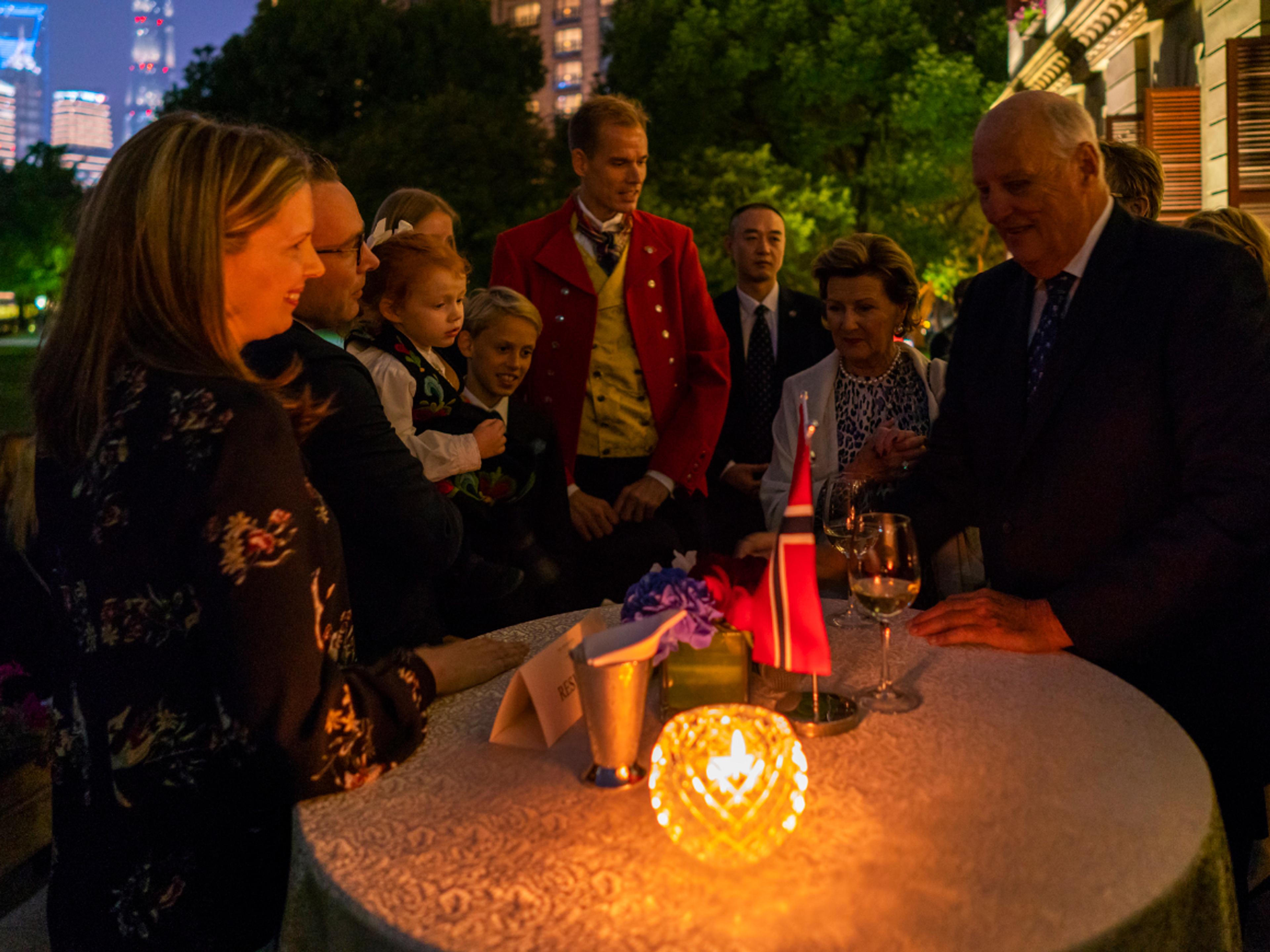 Kongeparet fikk møte mange av nordmennene som har slått seg ned i Shanghai og deres familier i dag.