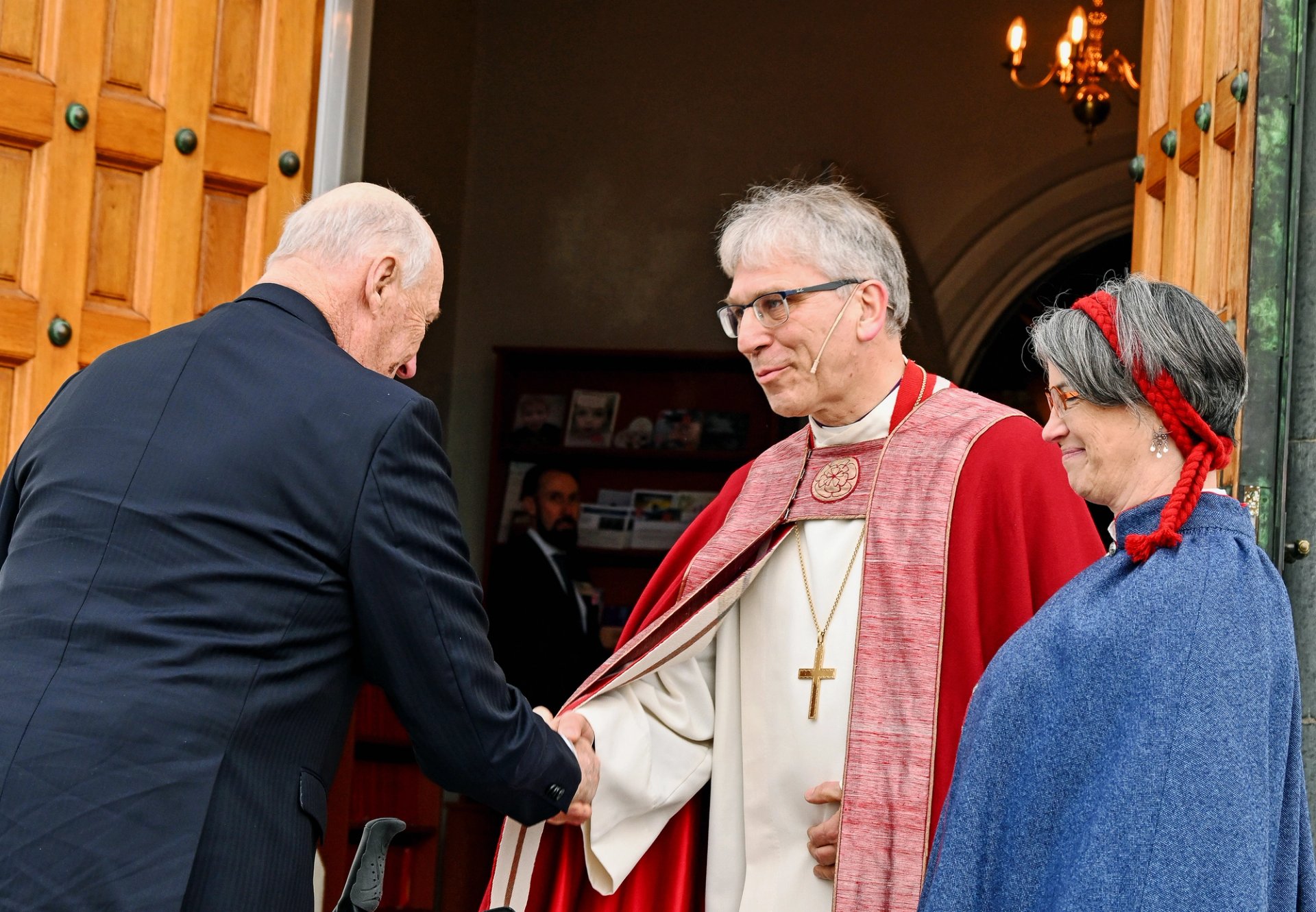 Kong Harald gratulerte den nye biskopen på kirketrappa, før Hamar kommune inviterte til mottakelse til ære for den nye biskopen.