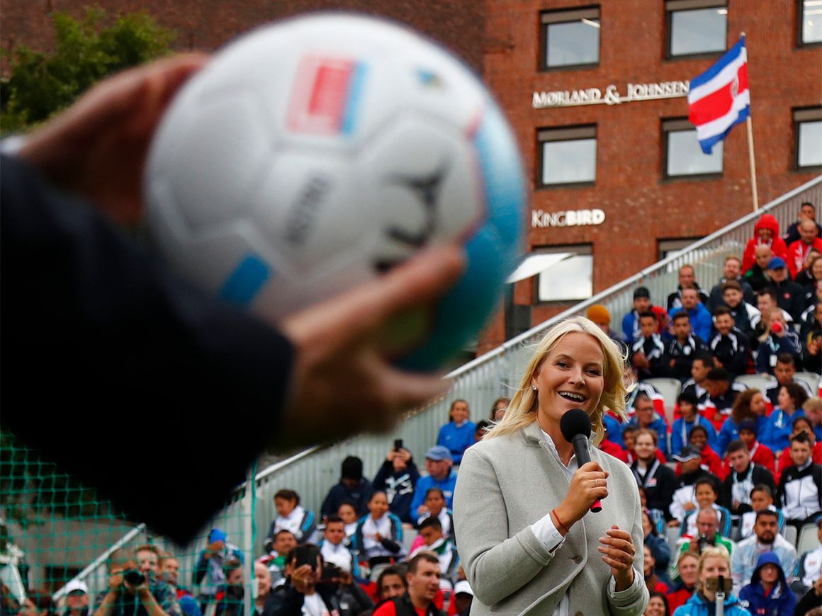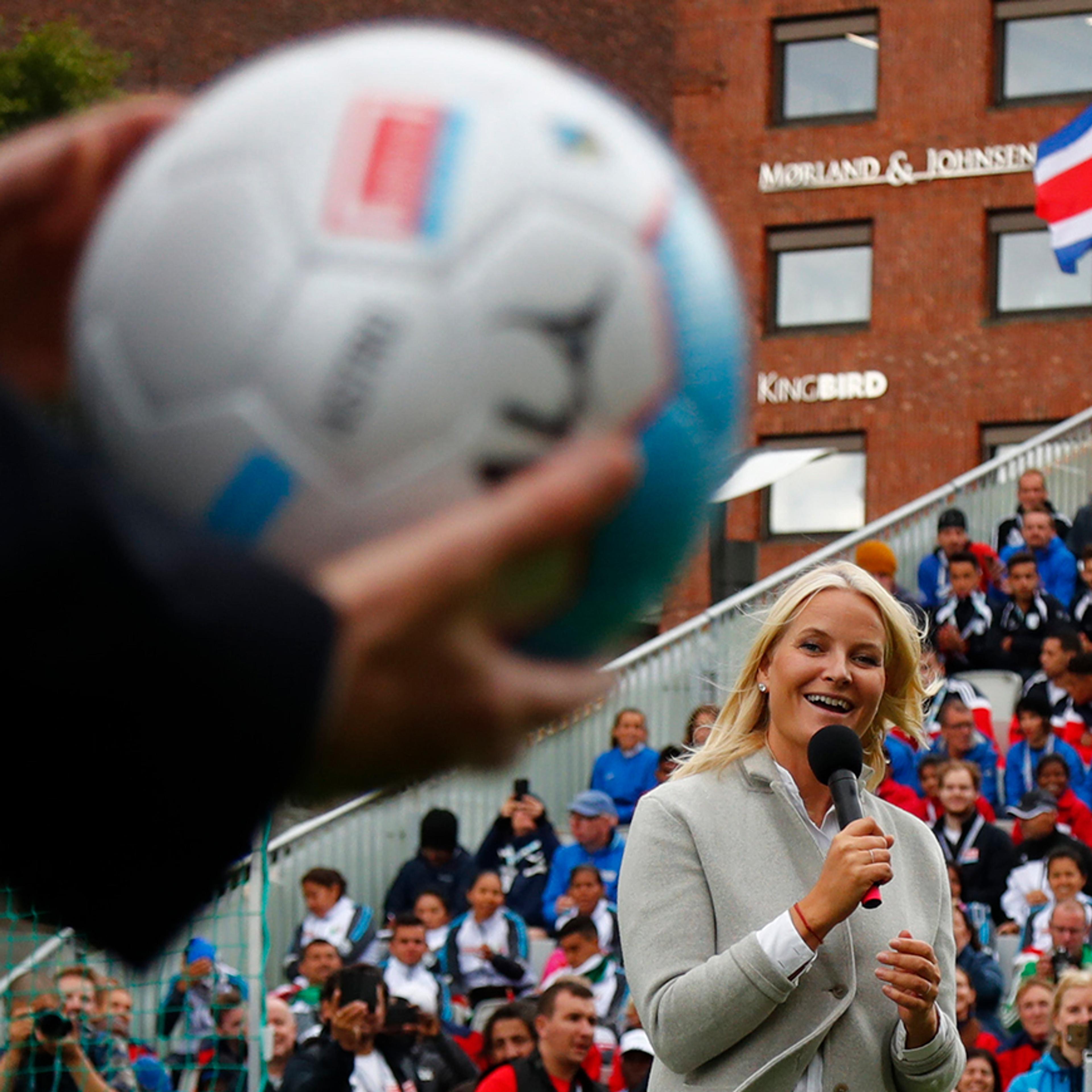 Kronprinsesse Mette-Marit fikk æren av å ta avsparket i dagens første kamp, der Norges damelag møtte Chile.