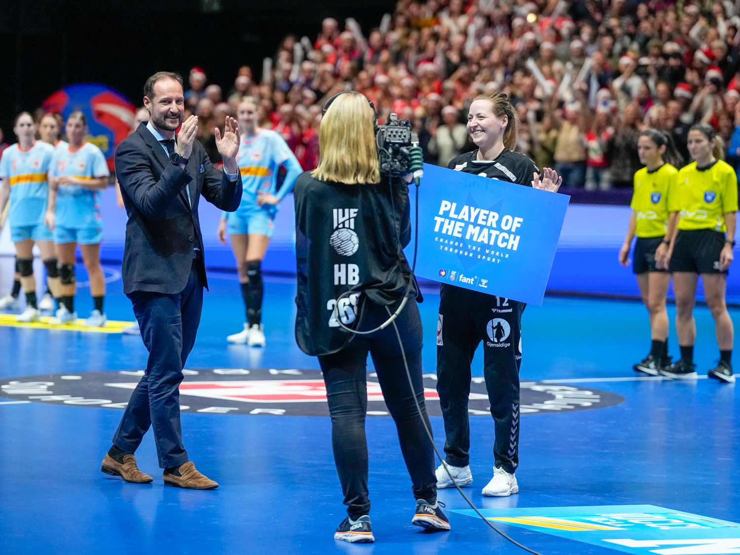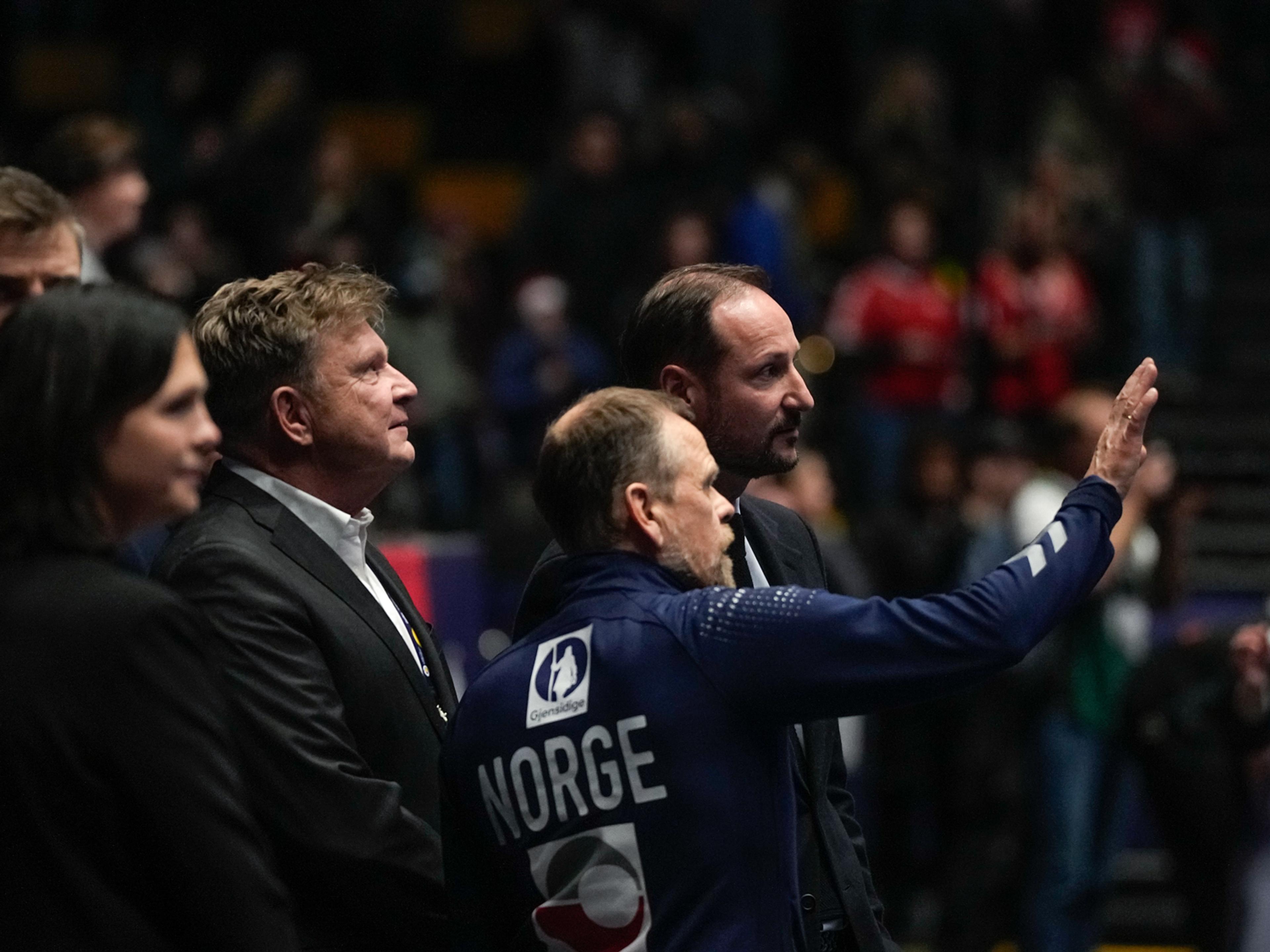 Hans Kongelige Høyhet Kronprins Haakon fulgte kveldens håndballdrama i Trondheim Spektrum fra tribuneplass. De norske håndballjentene er klare for semifinale i VM etter 30-23-seier mot Nederland.