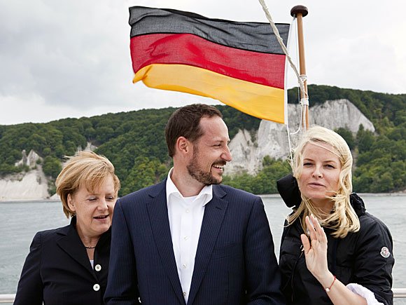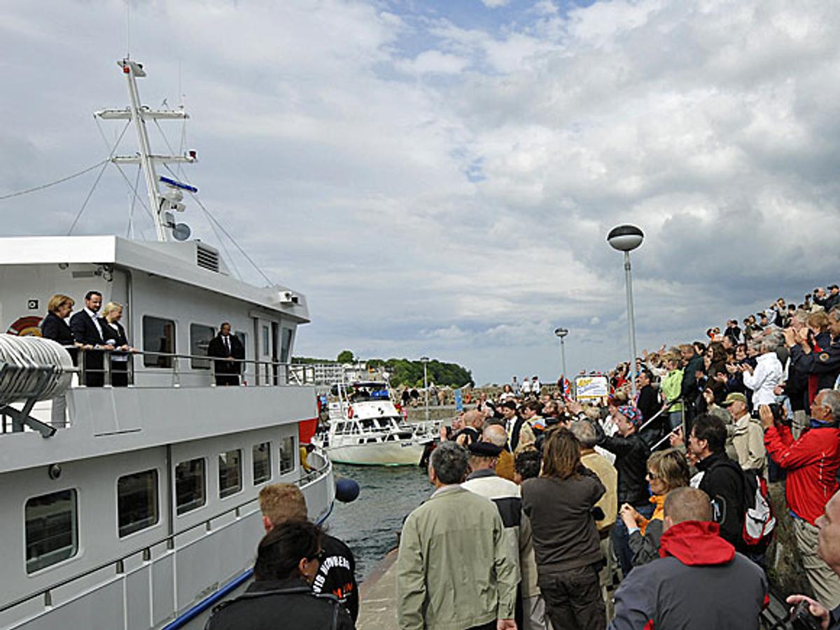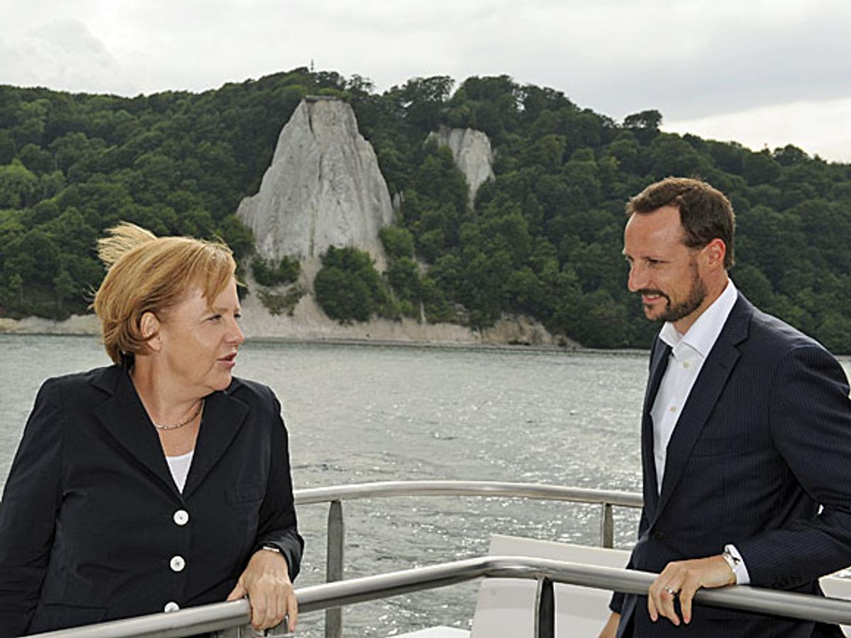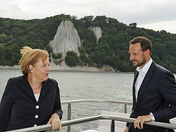Nach einem kurzen Spaziergang entlang der Mole ging die Delegation an Bord der M/S Nordwind. Hier hatten Kronprinz Haakon, Kronprinzessin Mette- Marit und Angela Merkel ausreichend Zeit, um miteinander zu sprechen und vom obersten Deck des Schiffs die Natur zu bewundern. Die Küste Rügens ist insbesondere für ihre weißen Kalksteinfelsen bekannt.