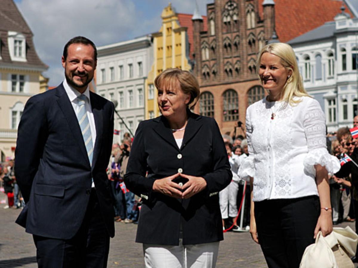 In guter Stimmung wurden Ihre Königlichen Hoheiten Kronprinz Haakon und Kronprinzessin Mette Marit von Bundeskanzlerin Angela Merkel heute Vormittag auf dem Alten Markt vor dem Rathaus in Stralsund empfangen.