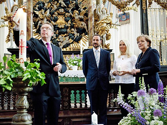 Anschließend entzündeten das Kronprinzenpaar und Angela Merkel eine Kerze und nahmen des Segen des Pfarrers entgegen.