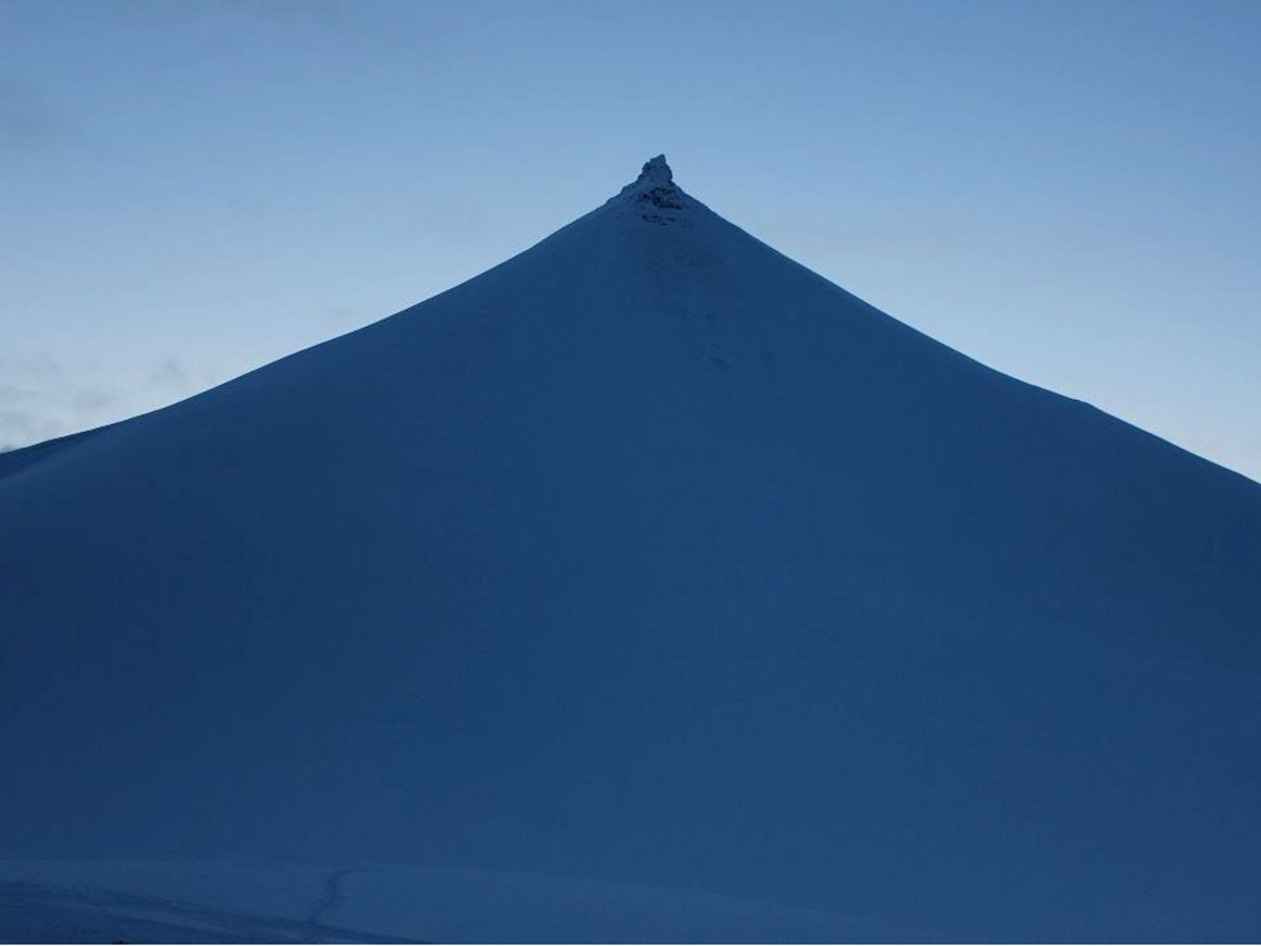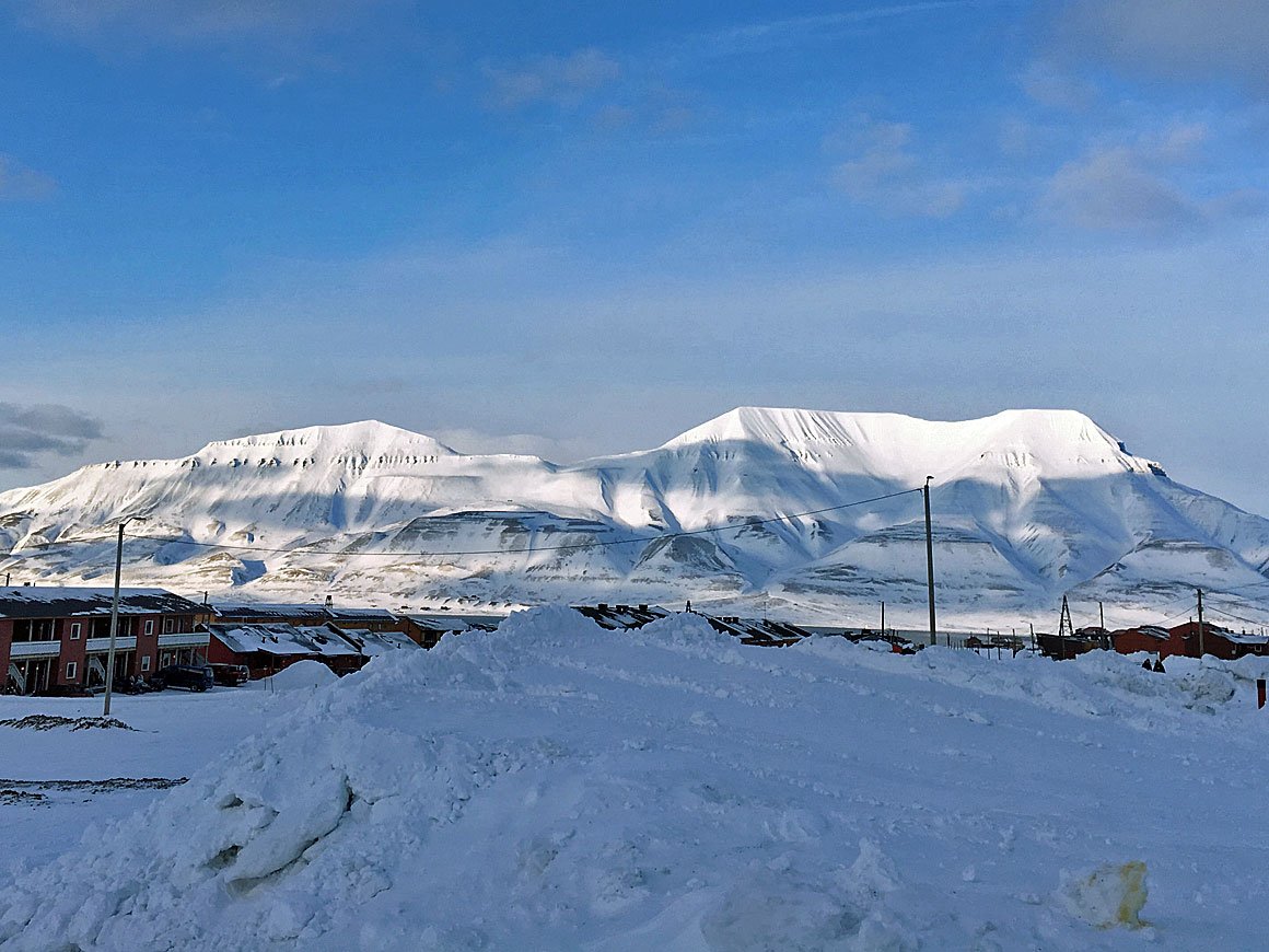 Hele landskapet ligger badet i lys blått. De hvite Hjort-fjellet står mot det dypt blåsorte havet. Lysene fra Longyearbyen funkler som små stjerner…