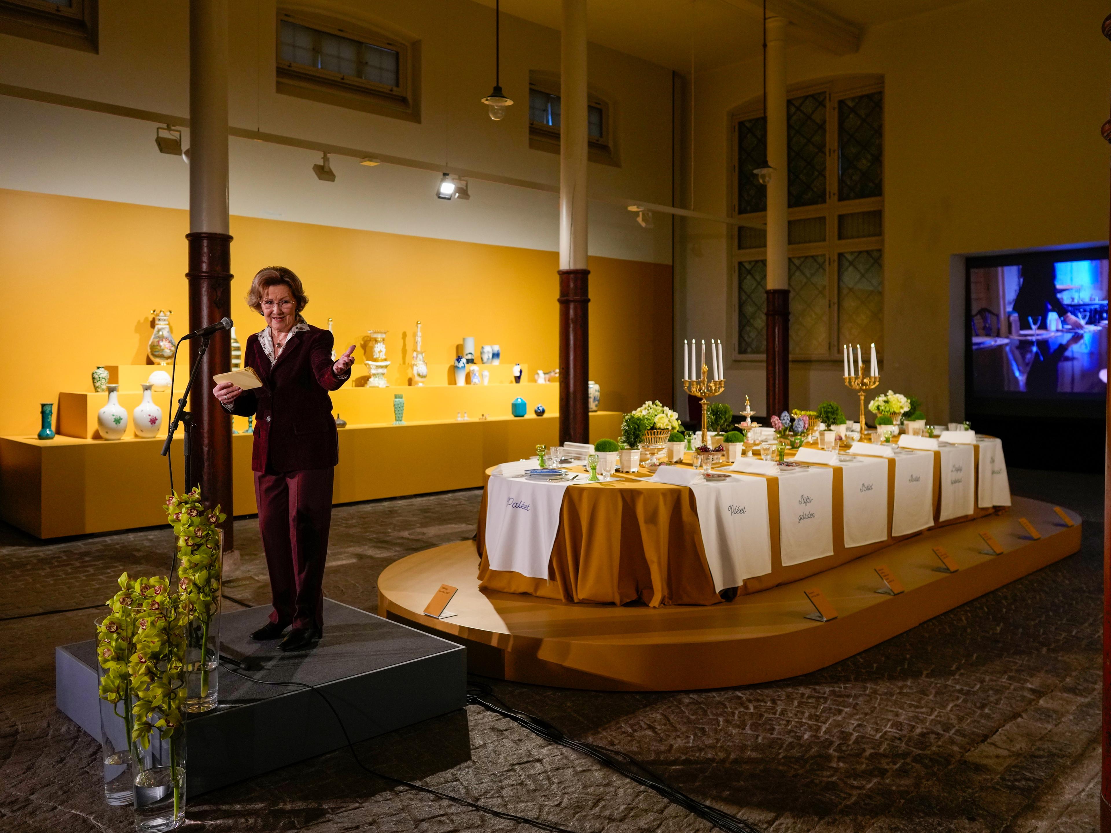 Vi befinner oss i utstillingen «Ved Kongens bord». Første del viser den historiske arven vår – den ser dere her i dette lokalet i Stallen. Mye av det som vises, er laget nettopp for å komme på majestetens bord.