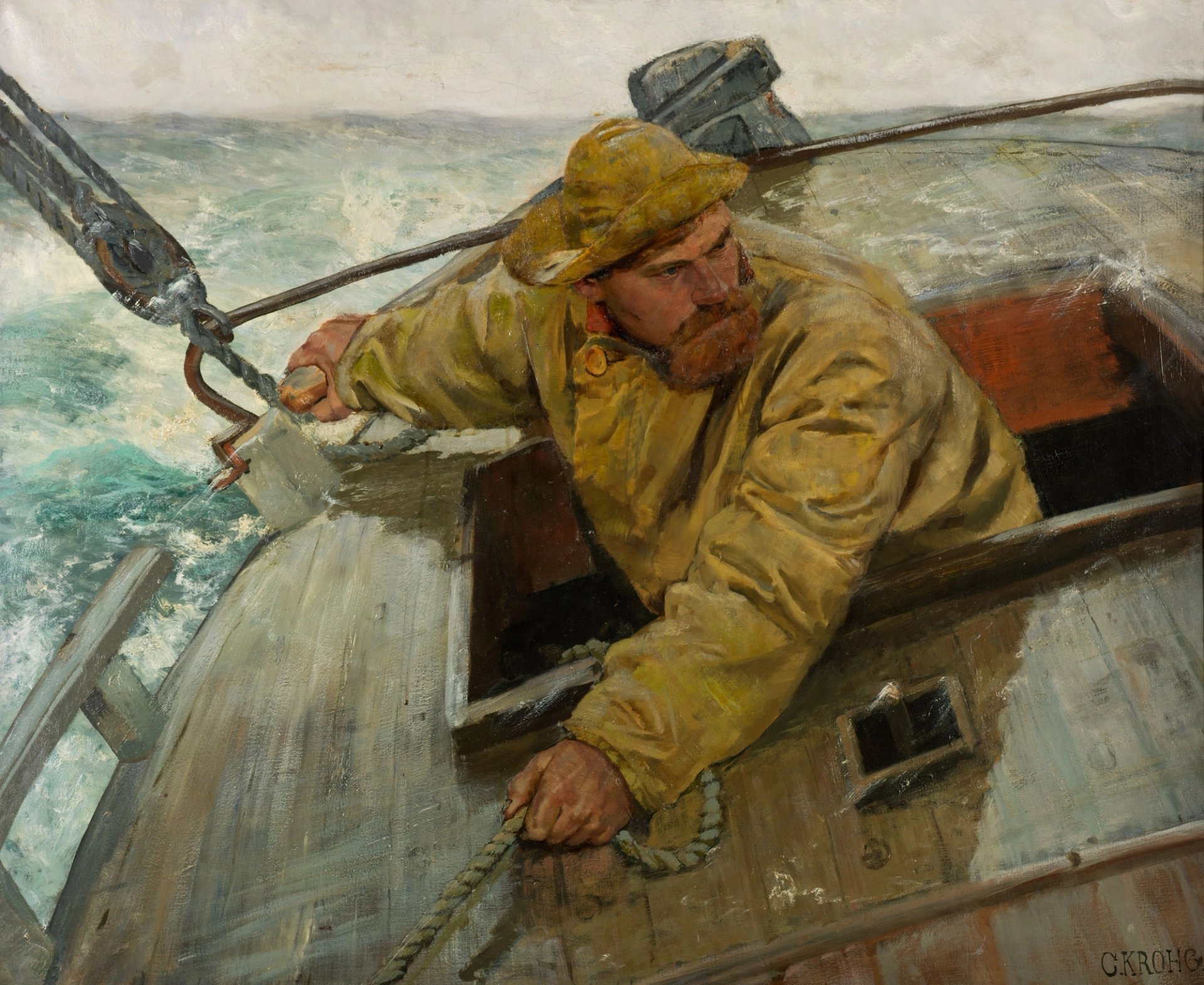 Der Harriet Backer maler kvinner inne, maler Christian Krohg en norsk mann ute – i det ikoniske maleriet Hardt le, som til daglig henger i Kongens arbeidsværelse. (Han savner det forresten hver dag!) Vi har nå flyttet oss til Norge, nærmere bestemt Hvasser, til et område hvor jeg selv har tilbragt alle mine somre – nemlig på Tjøme i Vestfold. Vi er på vestsiden av Oslofjorden, og tro meg: Her kan vi virkelig komme ut i stormfullt vær! Den sentrale norske naturalisten og Kristiania-bohem Krogh fremstiller losen Julius Pedersen Grepan som en representant for den djerve, vågale og barske norske sjømannen. Det er godt å ha en los som viser vei. Og det er godt å bli påminnet om at det underkjente plagget sydvesten er svært passende når det blåser som verst! Personlig har jeg annektert plagget og gjerne introdusert denne unike og praktiske hodebekledningen til utenlandske gjester.